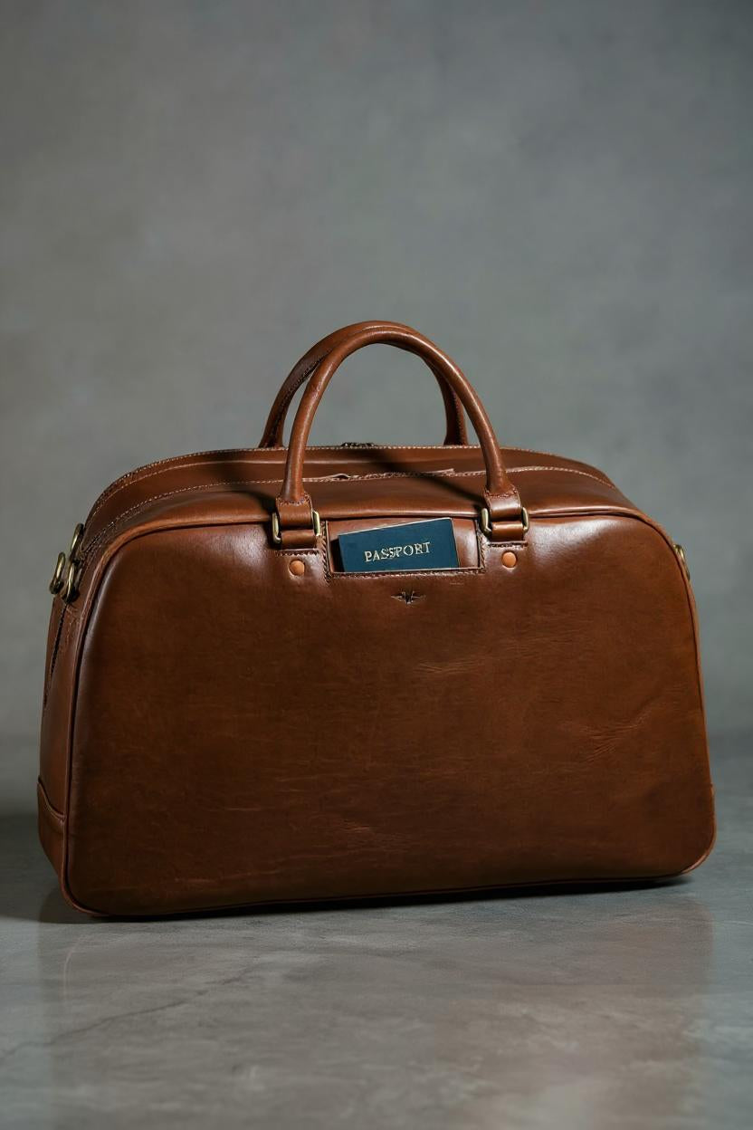 Crafted from premium brown leather, this elegant weekender bag combines rugged durability with a sophisticated design. Featuring a spacious interior with dual zipper compartments for easy access and organization, it’s perfect for your weekend getaways or business trips. The sturdy handles and refined brass hardware ensure durability while providing a stylish, classic look. Designed for those who appreciate quality craftsmanship and timeless elegance, this bag will complement any travel outfit with its modern yet vintage appeal.